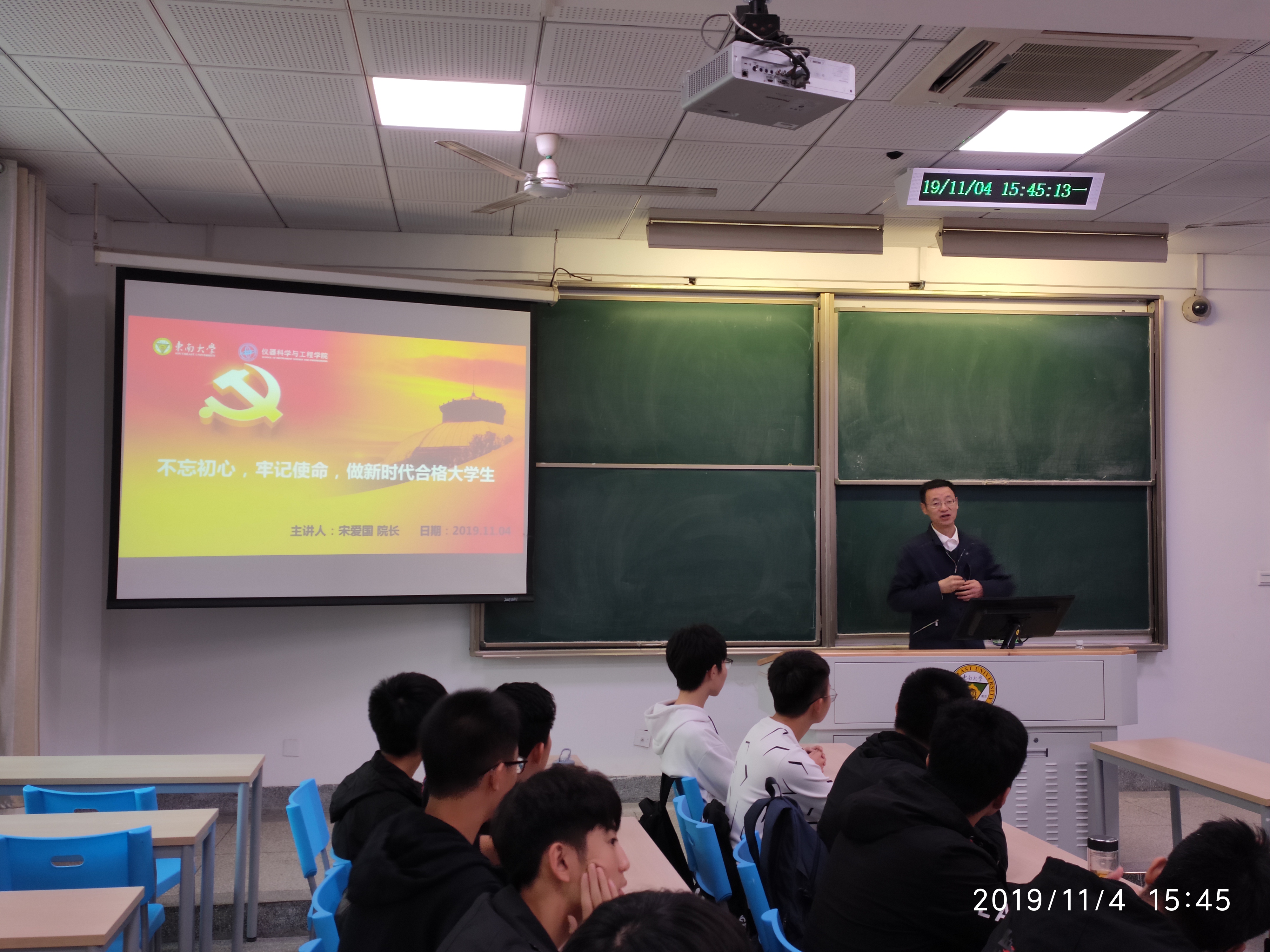 11月4日,宋爱国院长为G23191班同学讲授了题为“不忘初心、牢记使命,做新时代合格大学生”的专题党课。宋院长梳理了党的十八大以来习近平总书记关于青年工作的系列重要论述,鼓励同学们要学习并践行总书记对新时代青年的寄语和期望,在大学生活中学会学习、学会交流、学会创新。