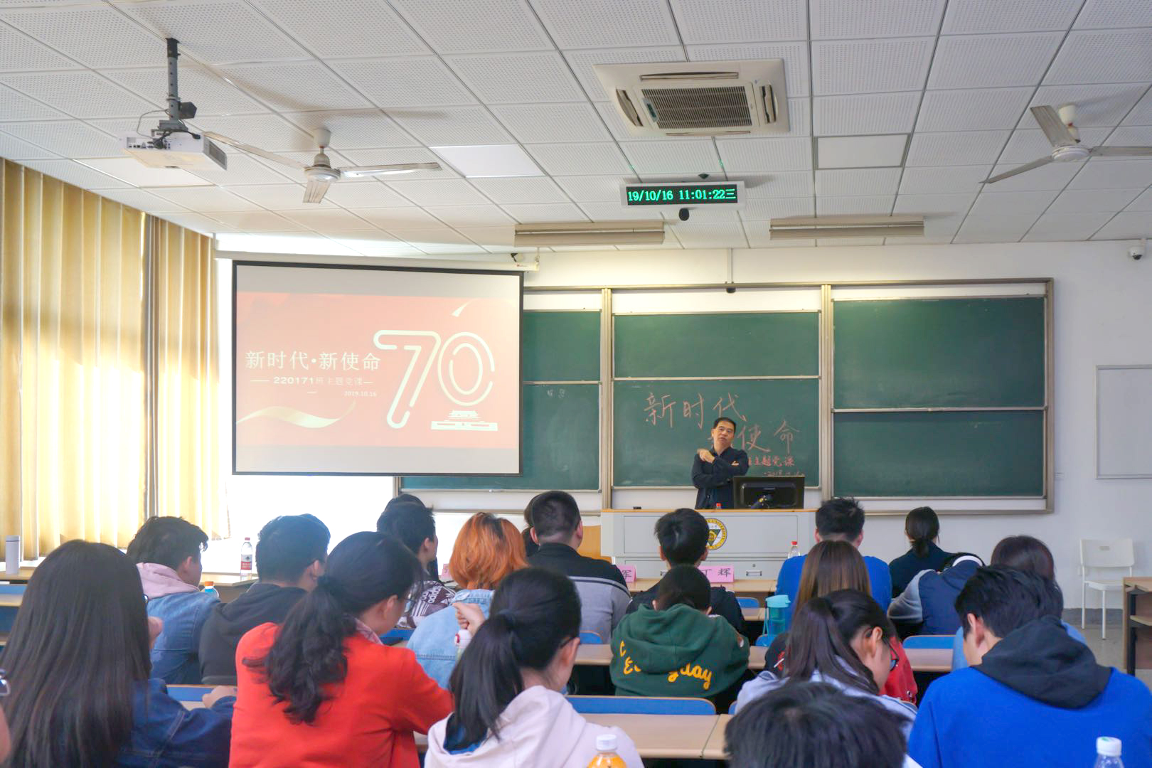 校党委常委、总会计师丁辉负责联系永利官网220171班。10月16日,丁总会计师为全班同学讲授了题为“新时代·新使命”的专题党课。他结合自己40年求学工作的经历,讲述了新中国成立70年来,中国共产党人带领全国人民不断砥砺奋进的发展历程。他指出,为中国人民谋幸福,为中华民族谋复兴,是激励一代代中国共产党人前赴后继、英勇奋斗的根本动力;同时,他对新时代的大学生们提出了殷切希望,要勇于承担时代使命,放宽眼界、放大格局,立足专业但又不局限于专业,要立志成为领军人才,甚至是领袖人才。
