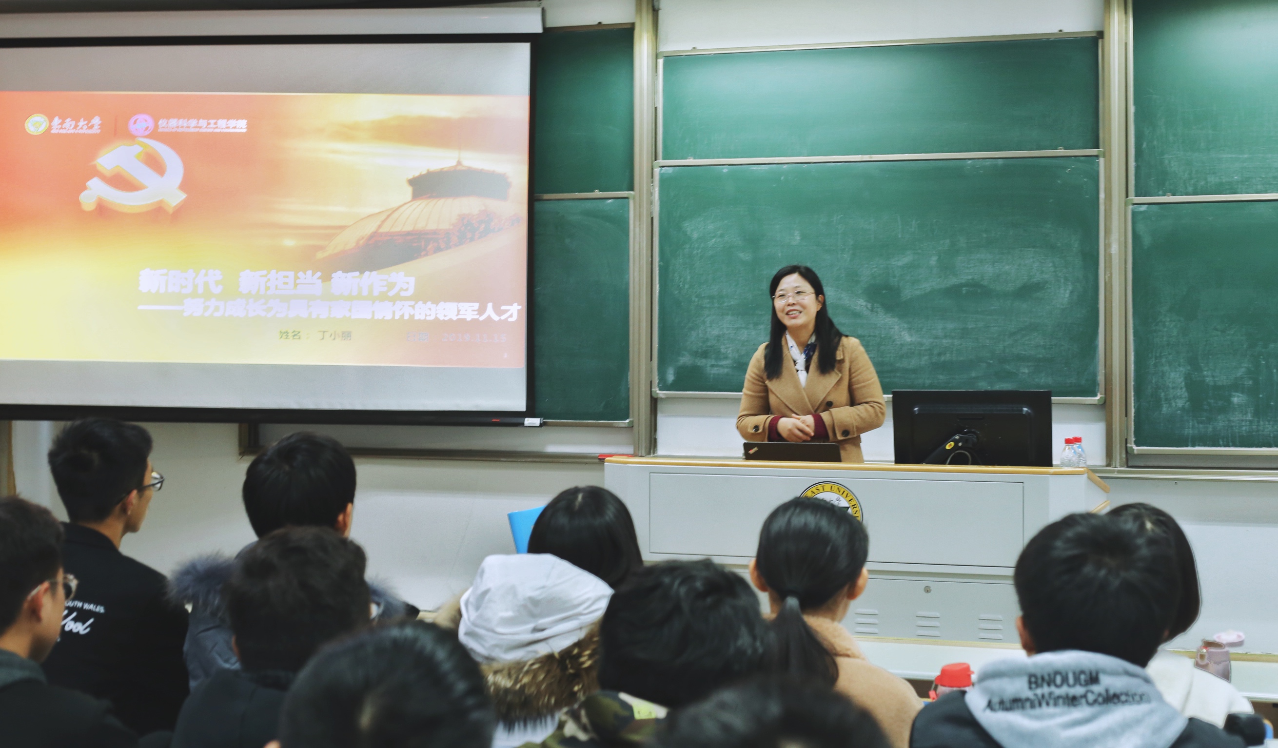 11月20日,学院党委副书记兼副院长丁小丽老师为G23194班同学讲授了主题为“新时代、新担当、新作为——努力成长为具有家国情怀的领军人才”的主题教育党课。她从习总书记论青年工作出发,鼓励同学们要勇于担当新时代中国青年的责任,做好学习工作规划,努力成长为具有家国情怀和国际视野,能够引领未来和造福人类的领军人才。