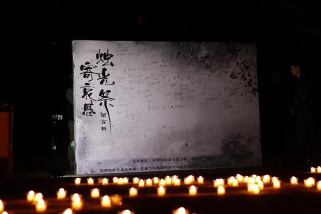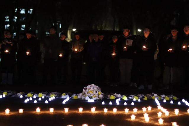 在四牌楼校区,树叶凋零的梧桐树下,东大学子用 500 多支蜡烛摆成和平鸽形状和“NJ·12.13”字样,参与纪念活动的同学、老师聚集于大礼堂前的空地上,通过追述史实、观看视频、诗歌诵读、敬献鲜花等形式,向无辜亡灵表达哀悼。