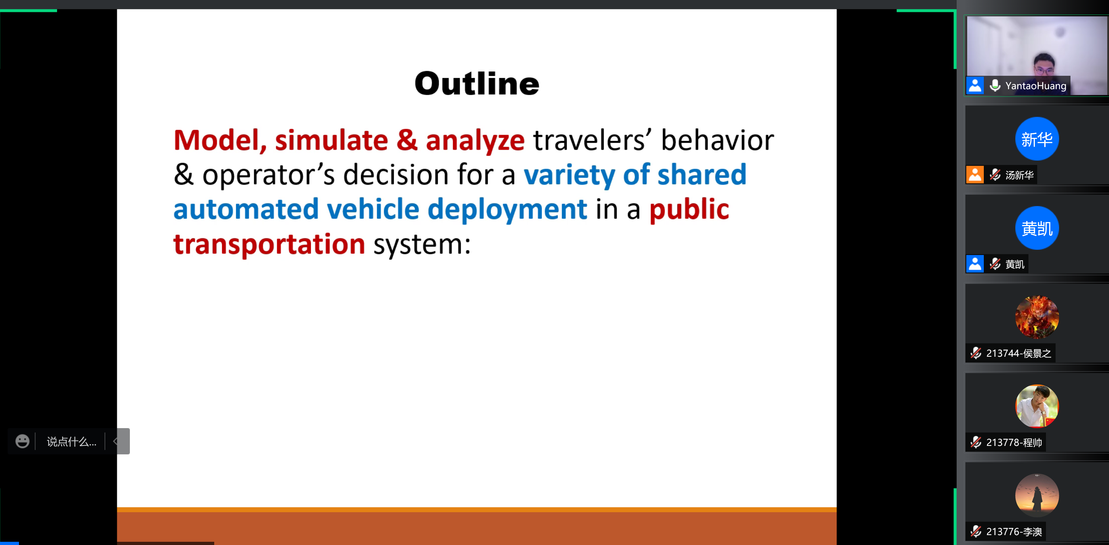 2022年5月1日晚20:30,仪科学院举办了三十周年院庆系列学术报告第十七场次,本次邀请到了美国德克萨斯大学奥斯汀分校博士后研究员黄彦韬分享其在“共享汽车系统仿真研究”相关科研成果。
