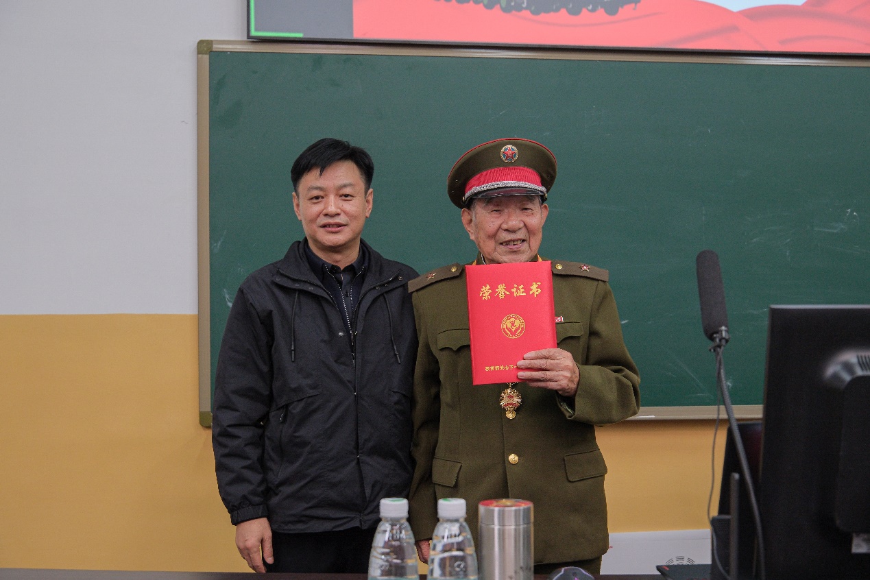 讲座开始前,yl23455永利官网党委副书记邢纪红致辞,对董老师三十五年来如一日投身国防教育表达了深深的敬佩与感谢,并为董老师颁发了2021年全国教育系统关心下一代工作“突出贡献奖”的奖牌与证书。董本植老师用“感谢、激动、感激”六个字表达了自己激动的心情,并表示是成千上万的学生和老师给予他力量,共同获得了此次荣誉。
