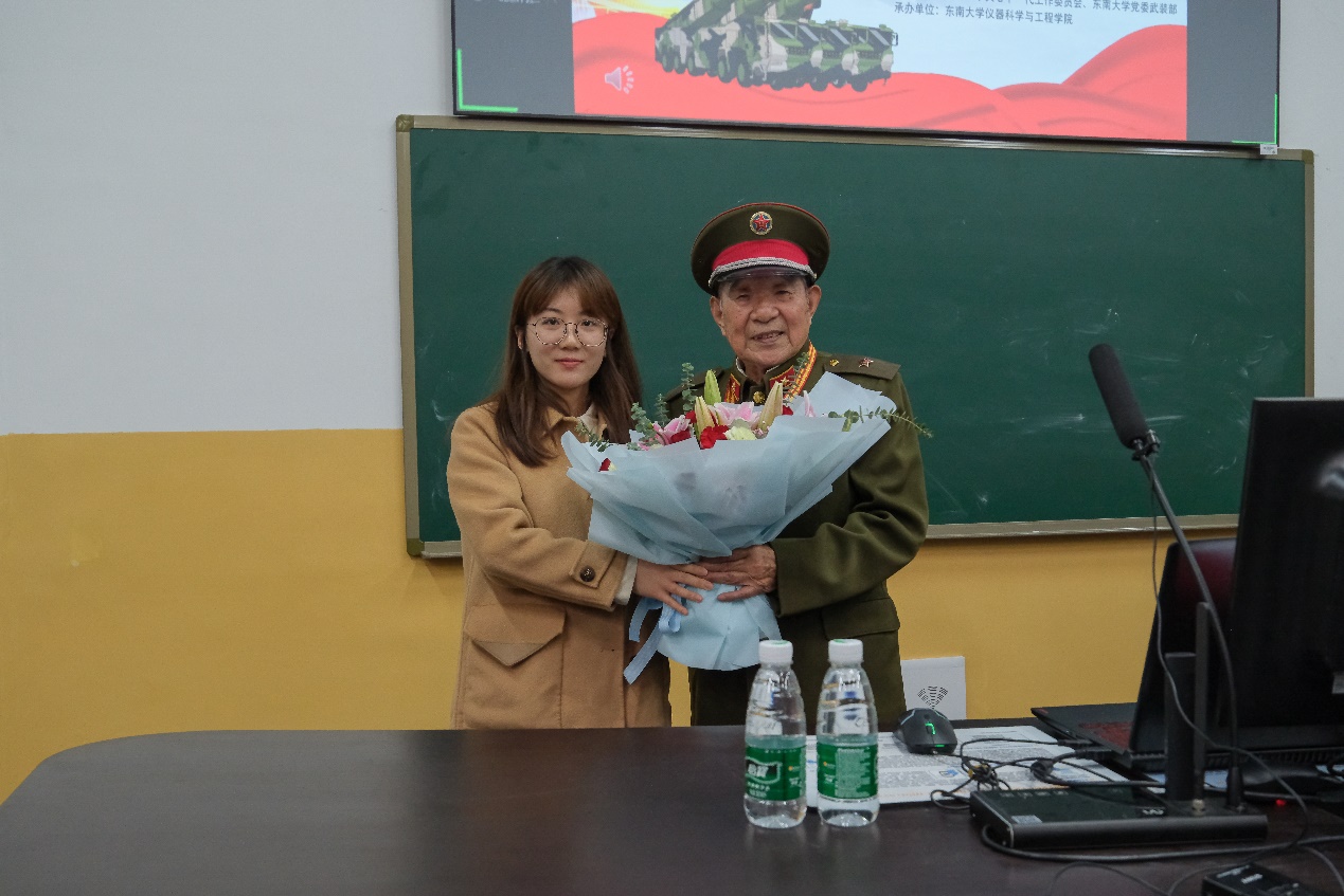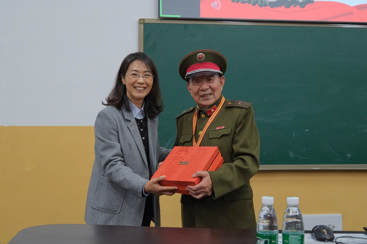 仪科学院闫宇楠同学代表所有同学们给董老师献花,感谢董老师对青年学生们无私关心与爱护。在多年的国防教育活动中,董老师也与很多老师结下了深厚情谊,仪科学院党委书记王军老师代表教师,向董老师赠送礼物,感谢董老对yl23455永利官网国防教育事业深深的情怀,对三尺讲台的无限热爱。