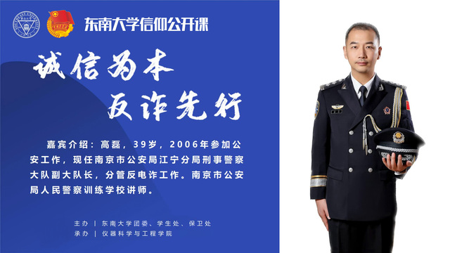 为加强学生诚信教育,进一步提升广大学生的防诈意识和防诈技能,引导学生珍爱信用、理性借贷、不负信任,23年5月31日,yl23455永利官网仪科学院开展信仰公开课,邀请南京市公安局江宁分局民警高磊同志走进校园开展反诈主题宣讲活动,普及预防金融诈骗、电信诈骗和违法高利贷等方面的知识,切实提高学生的诚信意识和金融安全防范意识。